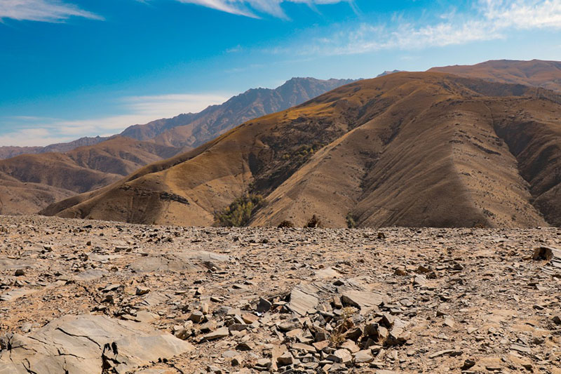 The mountains and foothills are about 1/5 part of the country. The east of the country is dominated by middle and high landforms. within the republic. Within the territory of the country there are the slopes or the closure of the West Tien Shan (Ugam, Pskem, Chatkalskiy, Kurama) and the Pamir-Alai (Zeravshan, Turkestan, Hissar, Kugitangtau Baysuntau). To the south and west, they gradually fall and into the plains. Stretch between mountains large cavities: Kashkadarya, Surkhandarya, Zarafshan, Samarkand are located. The largest intermountain trough - Ferghana hollow (valley) - lenght 370 kilometers and width up to 190 kilometers. On three sides of it are surrounded by the mountain ranges and is opened only from the west.